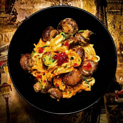 Pasul 1Pune nucile caju in 50 - 100 ml de apa, cu sare si catelul de usturoi, maruntit. Poti sa le pui direct in blender, cu intentia de a le procesa mai tarziu.Pasul 2Morcovul si cartoful se curata de coaja si se spala impreuna cu dovleceii. Se spiraleaza